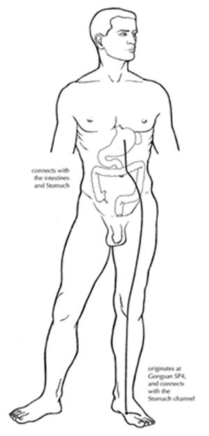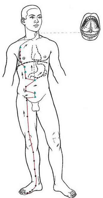 - Luo longitudinal: inicia en el 4 B, sigue el meridiano principal, alcanza el abdomen y por debajo del ombligo penetra al interior para distribuirse por el Intestino Grueso y el Estómago.