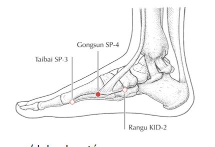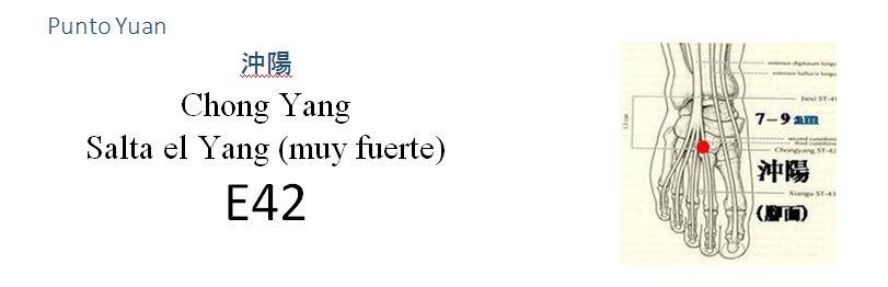 - Luo tranversal: 4 B hacia 42 E, punto yuan de Estómago.
